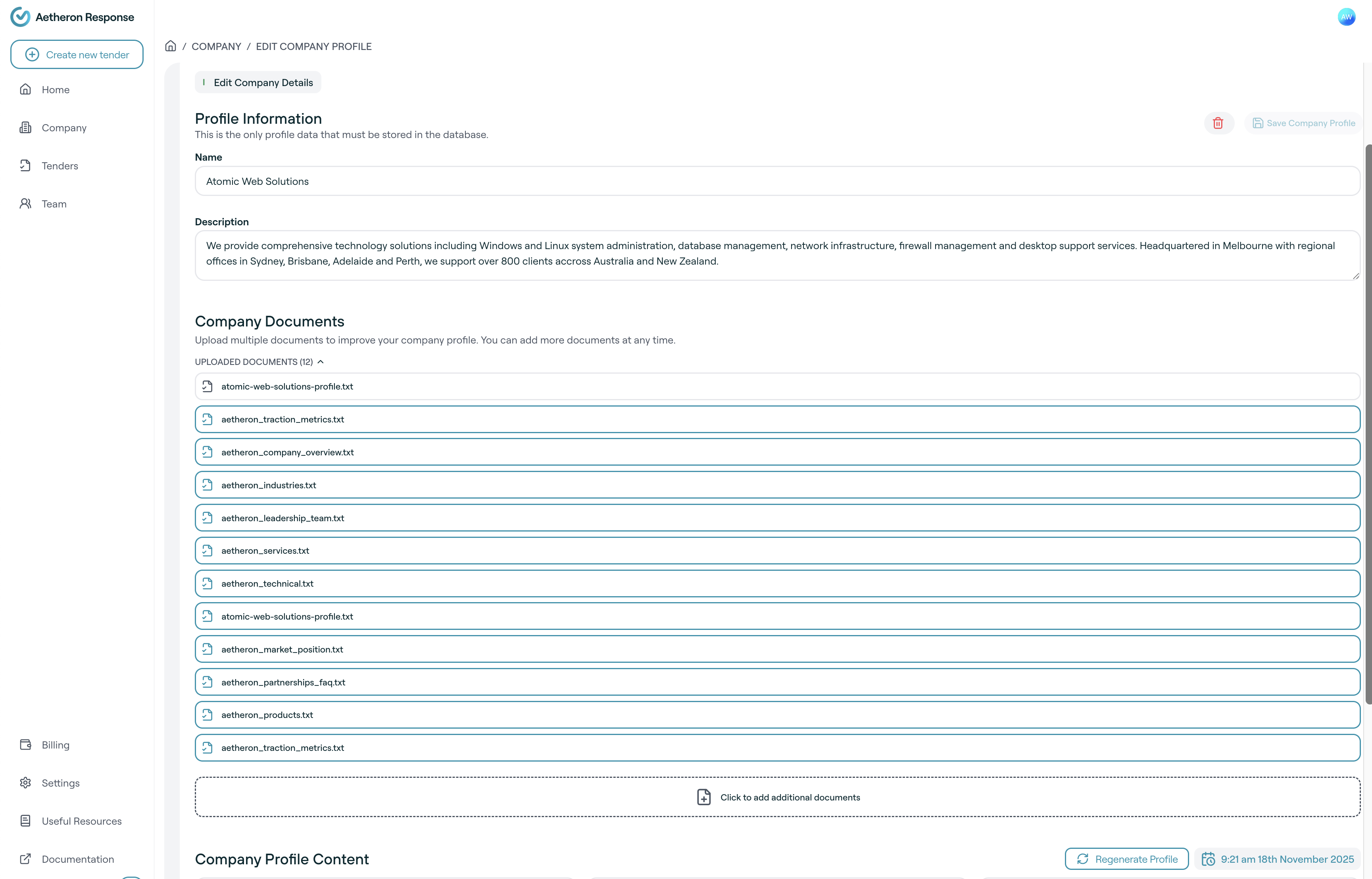 Keeping your company profile up-to-date is essential for generating accurate, compelling tender responses. This guide explains how to edit your existing company profile, including updating basic information and managing documents.