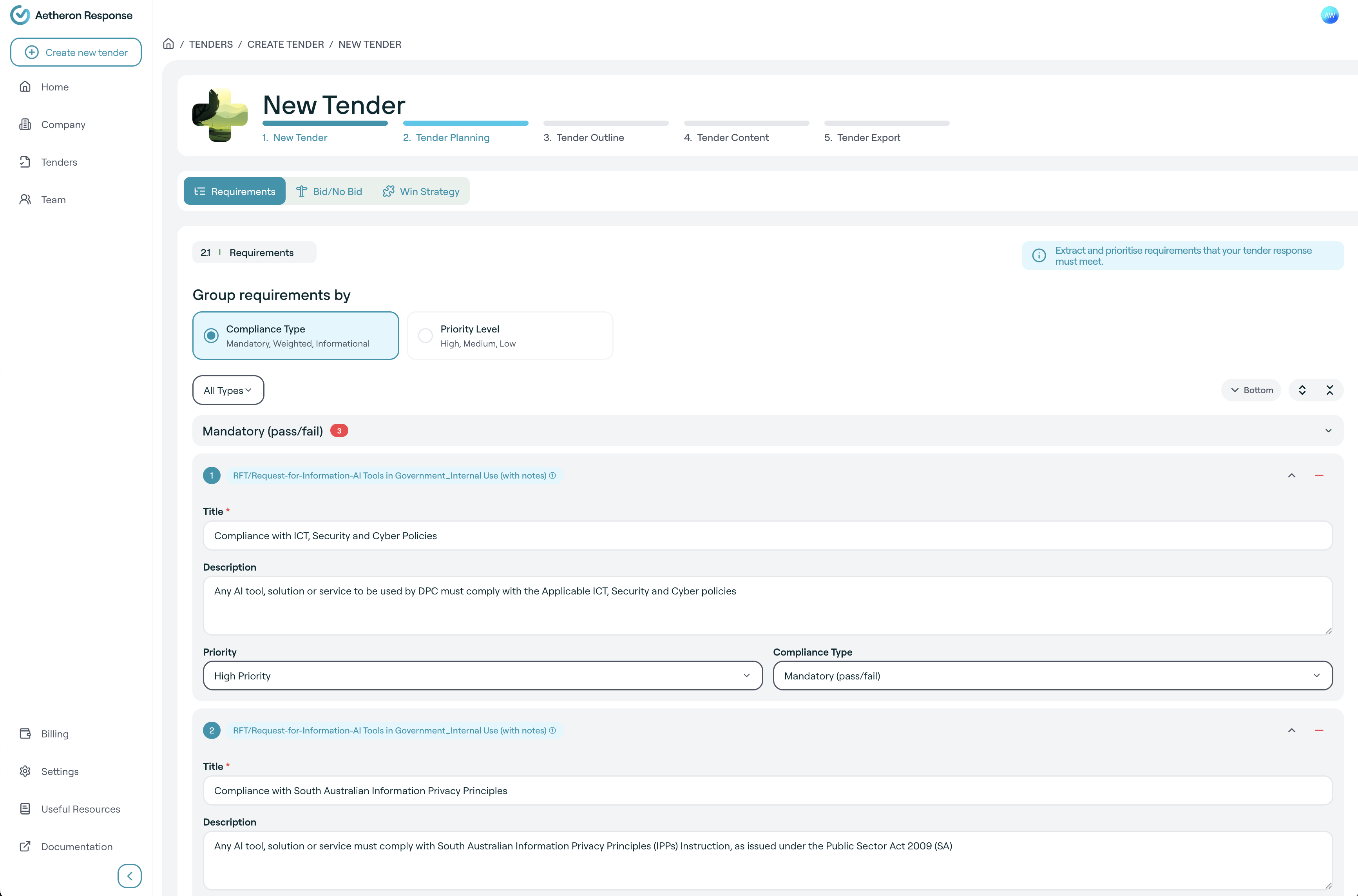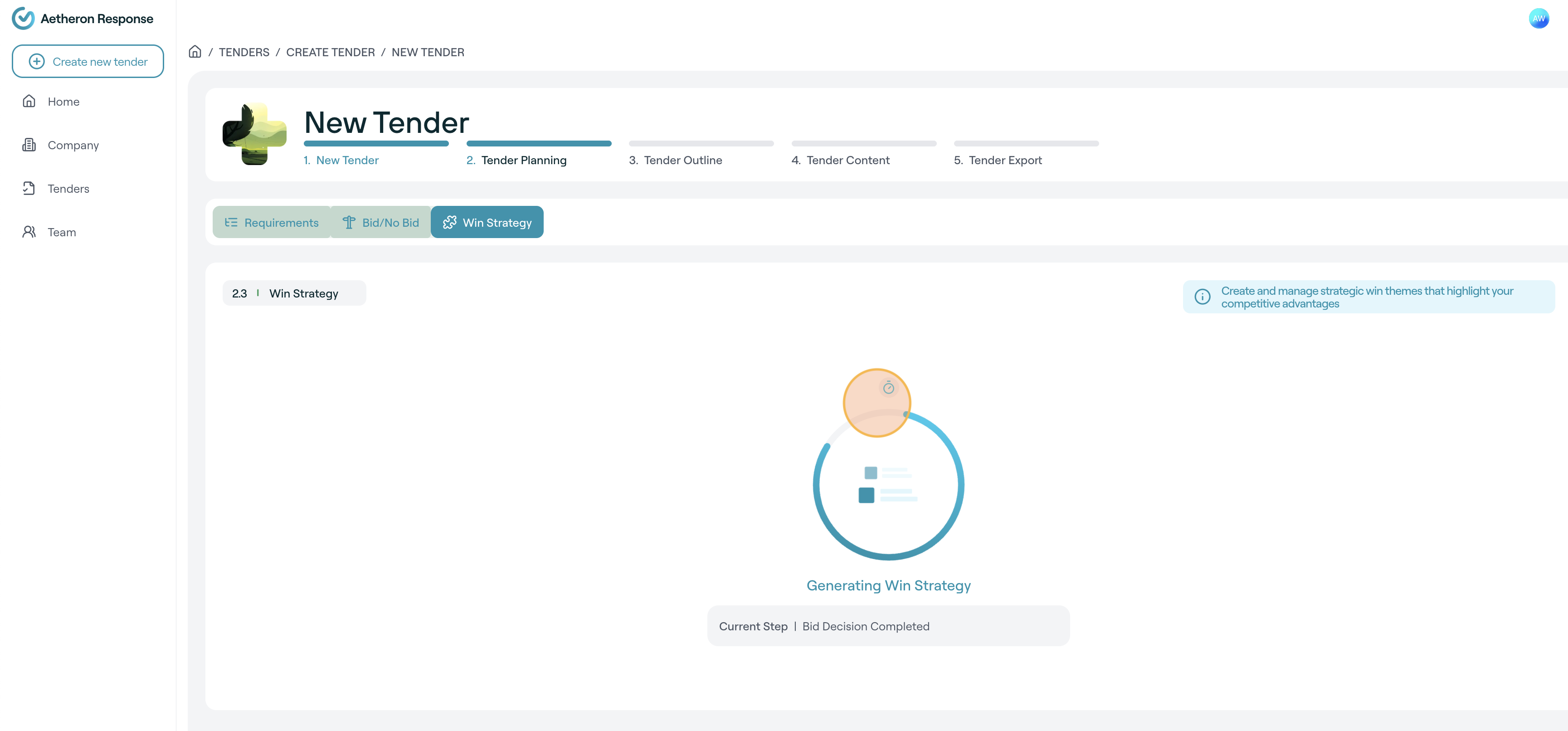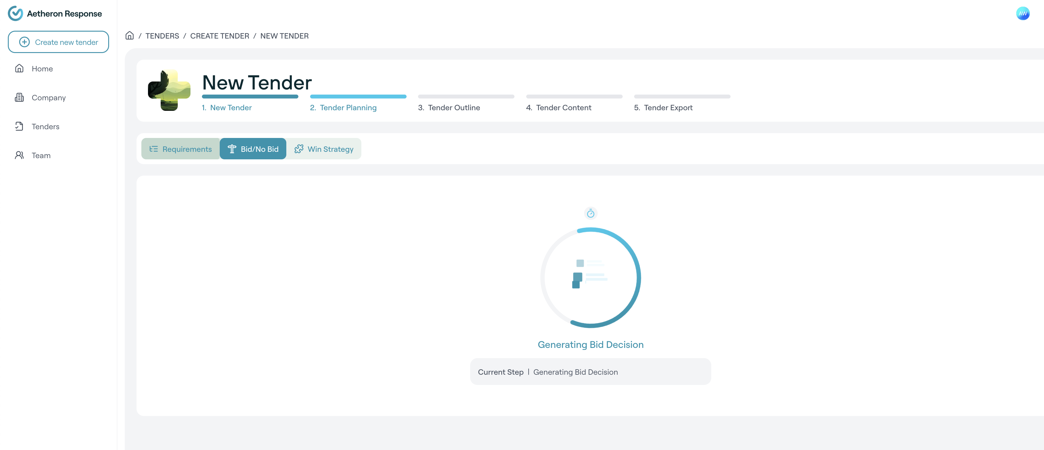 The Tender Planning phase is where Aetheron Response analyses your uploaded RFT document and helps you make strategic decisions about your tender response. This phase includes requirements extraction, bid/no-bid decision analysis, and win strategy development.