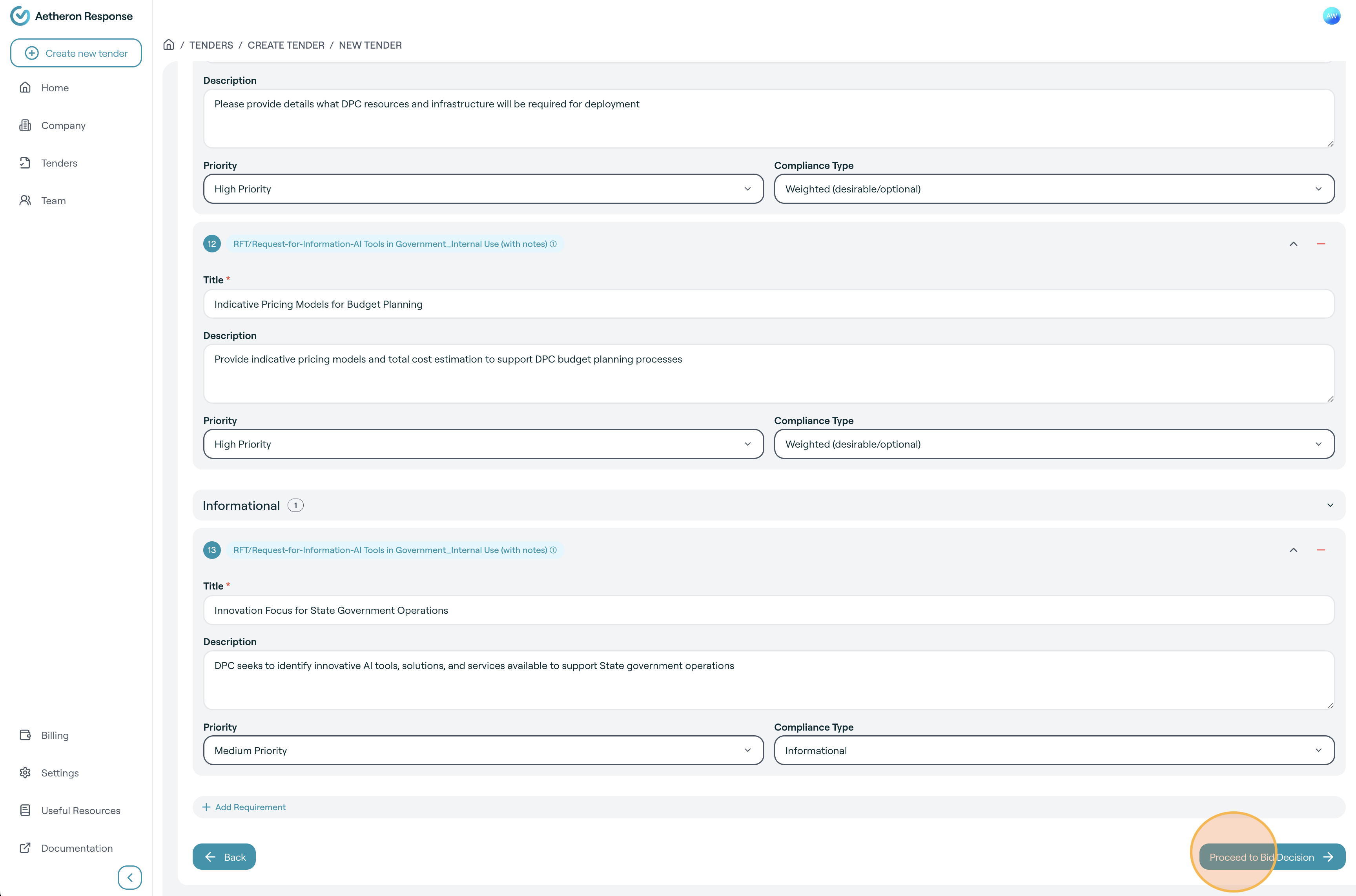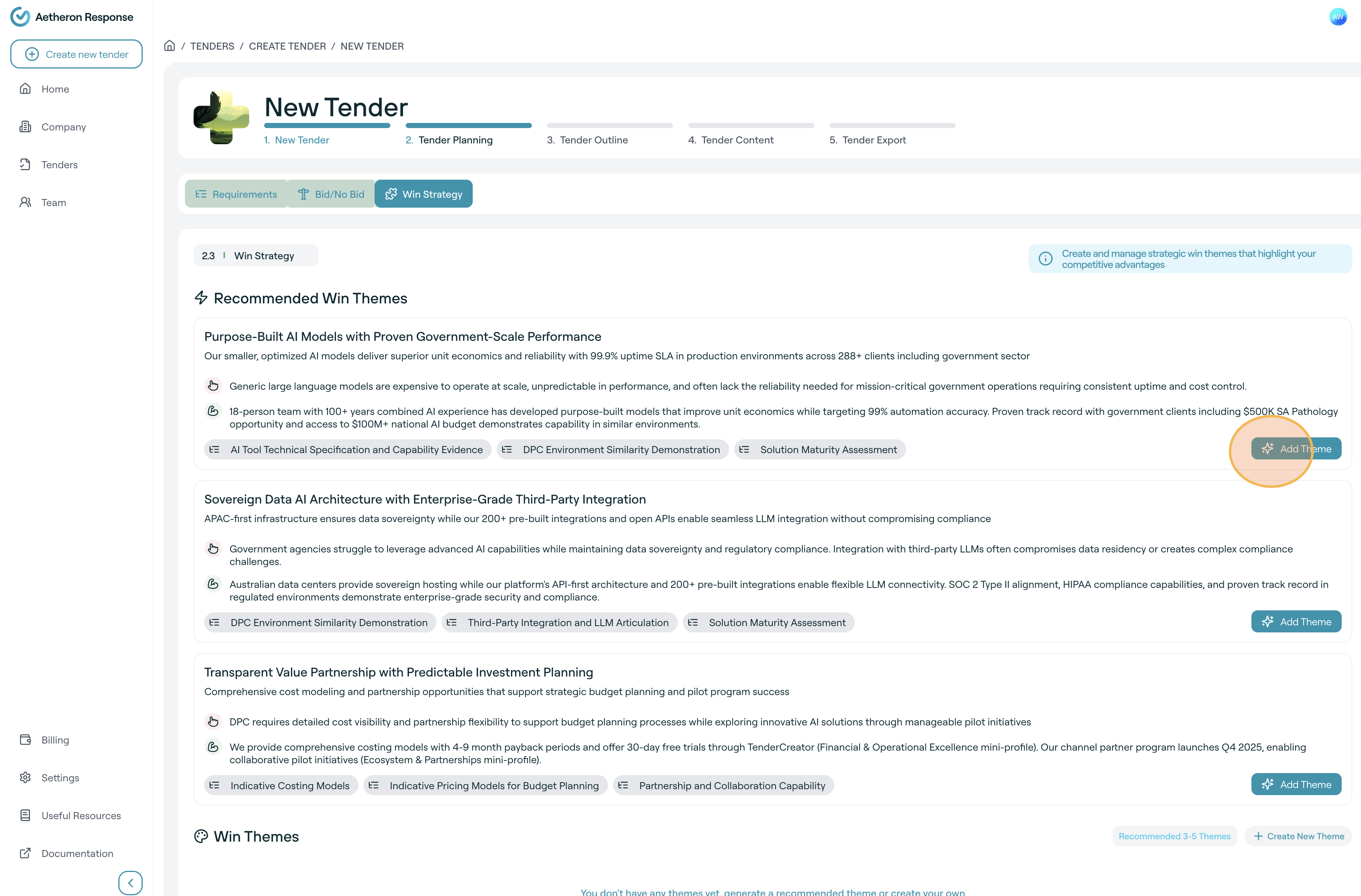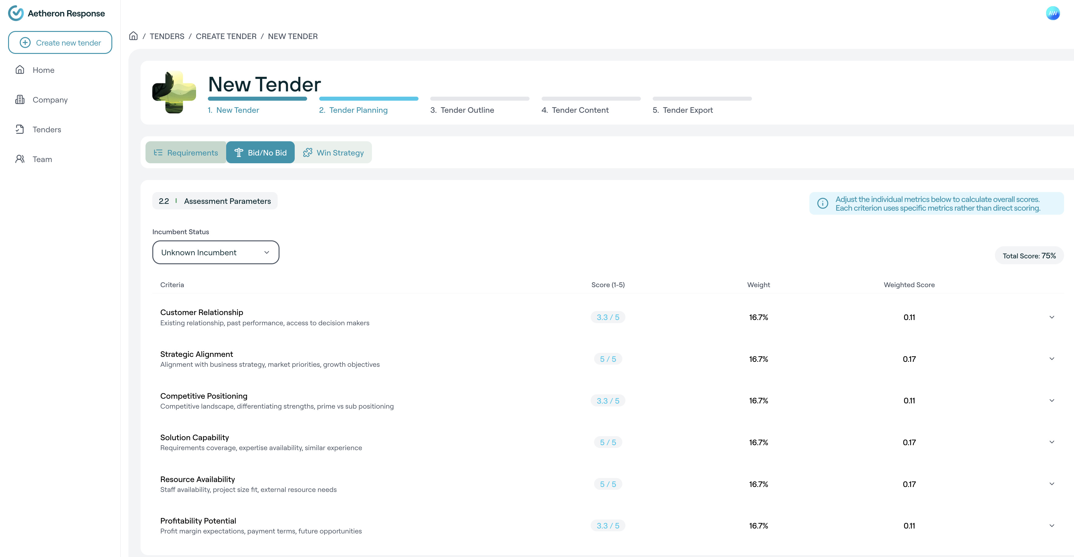 The Tender Planning phase is where Aetheron Response analyses your uploaded RFT document and helps you make strategic decisions about your tender response. This phase includes requirements extraction, bid/no-bid decision analysis, and win strategy development.