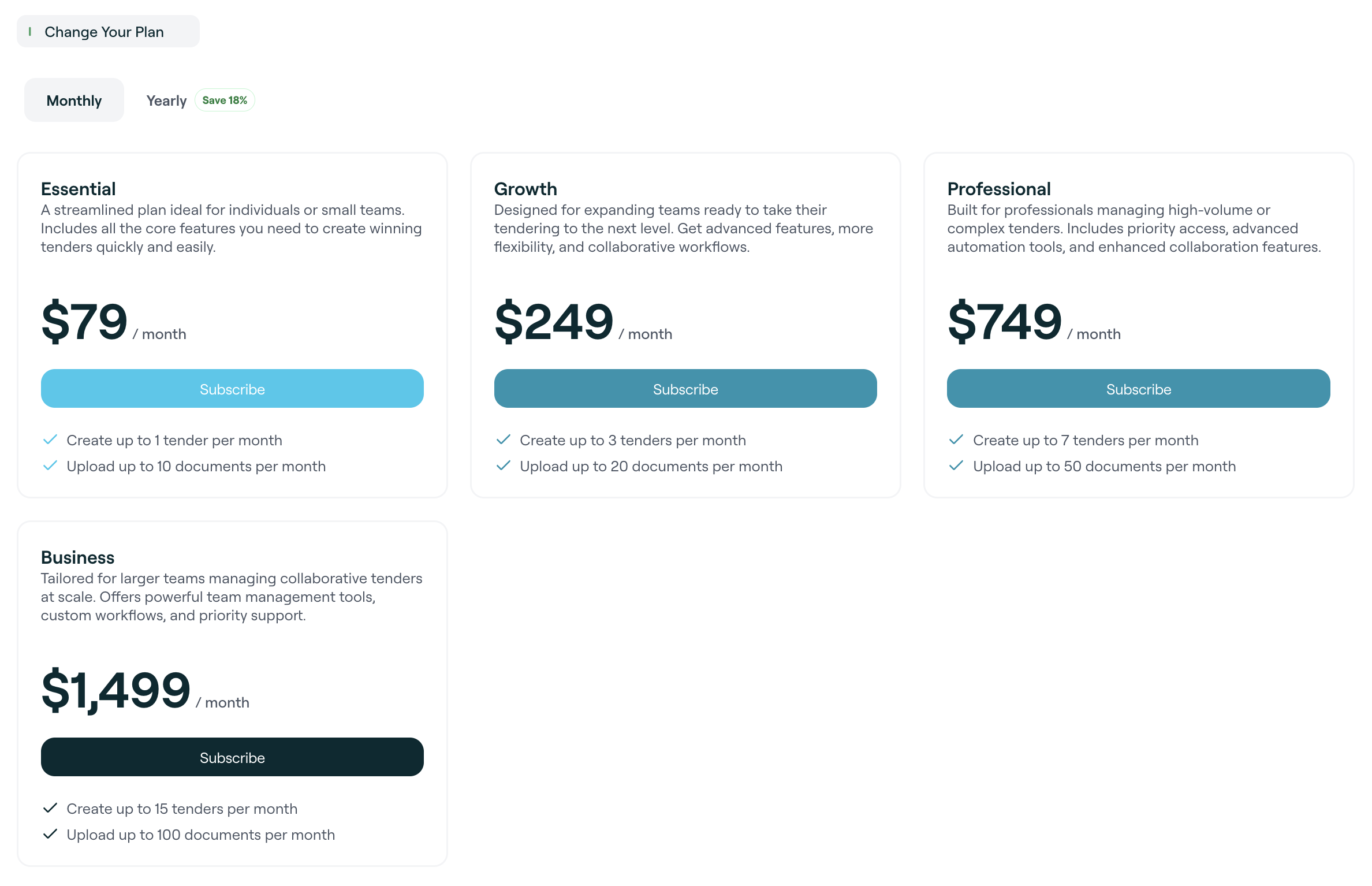 - Business ($1,499/month): 15 tenders, 100 document uploads